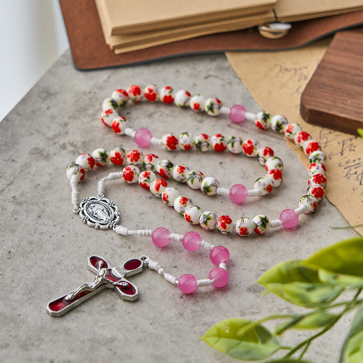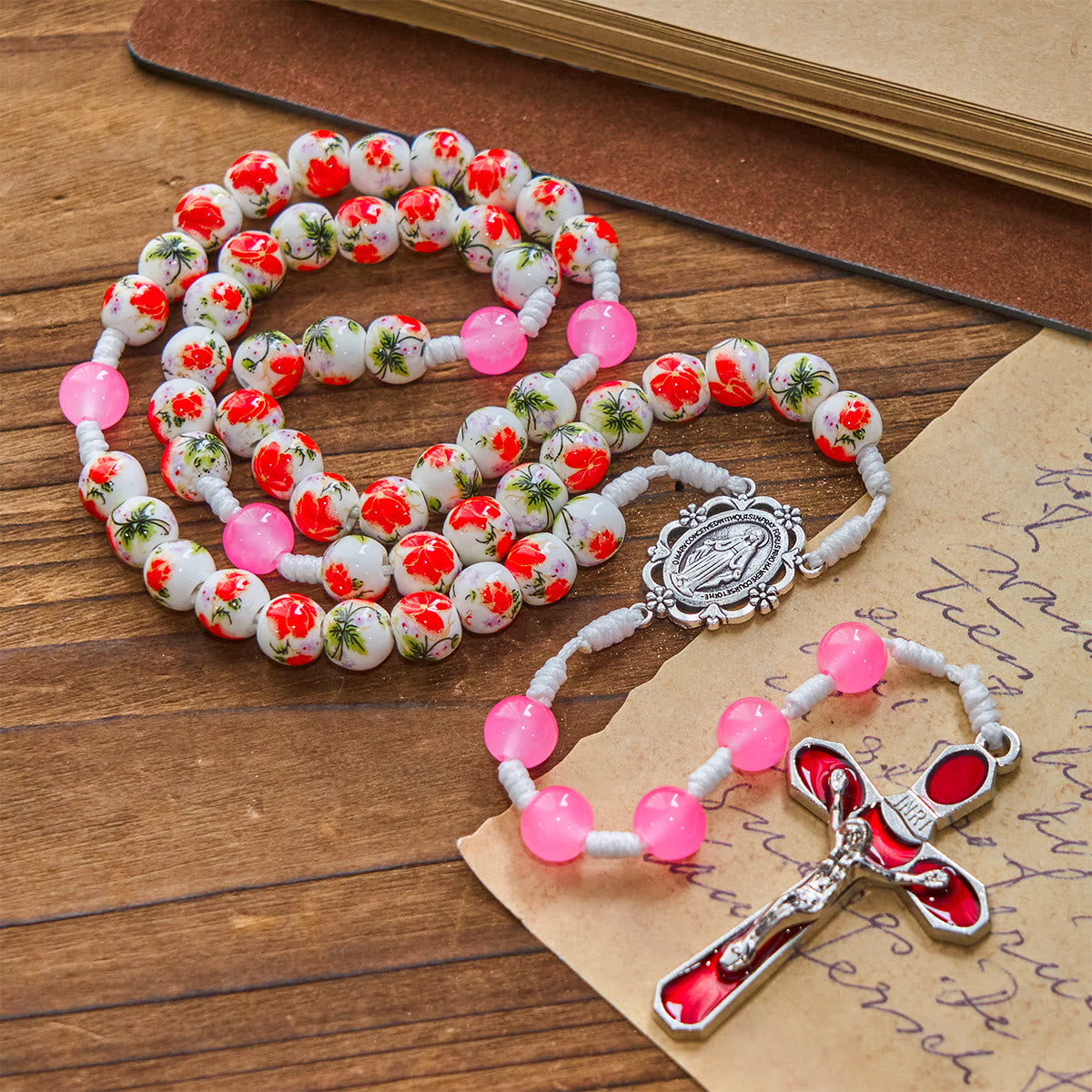Meticulously strung, 8mm flower – patterned beads pair with silver and red enamel charms. Each bead and symbol reflects careful artistry, creating a delicate, faith – filled accessory. -