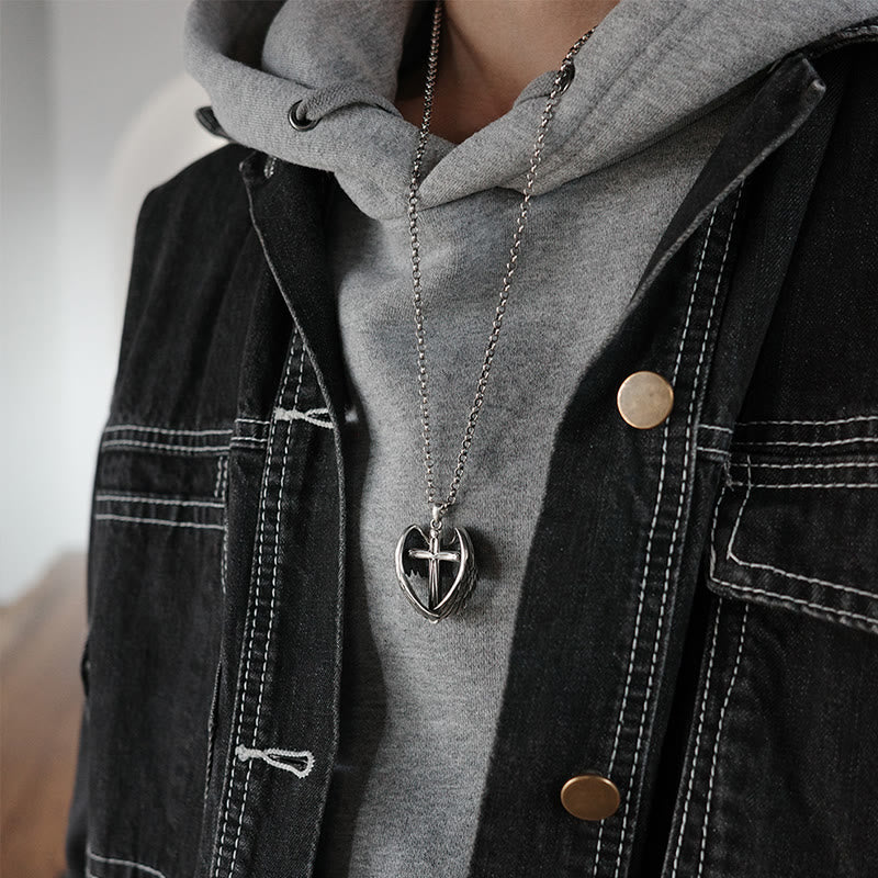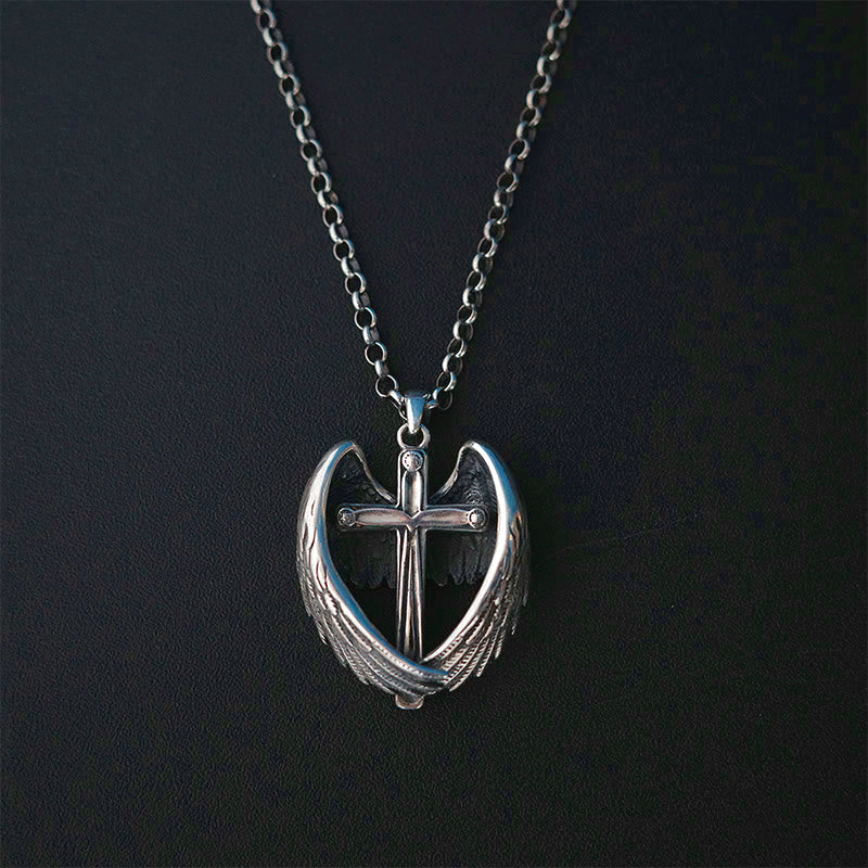 This necklace, the simple silver chain is delicate and soft in color, and it quietly droops, outlining elegant lines. Under the silver chain, the pendant is the visual focus. The cross is classic in shape, with simple and powerful lines, symbolizing faith and protection. What is particularly unique is that the cross is surrounded by a pair of spread wings, the wings are meticulously carved, and the texture of the feathers is clearly visible, as if it will take off in the next second. -
