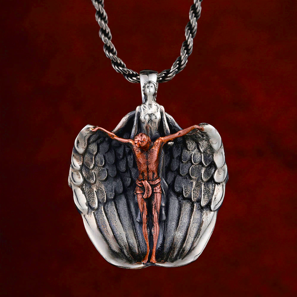 Crafted from premium 925 sterling silver, every contour and curve of this necklace is a testament to masterful craftsmanship. The wings are textured to mimic the delicate feathers of angels, while the figure on the cross is sculpted with lifelike precision. The silver has a soft, lustrous patina, like moonlight reflecting off a sacred relic, promising enduring beauty and quality. -