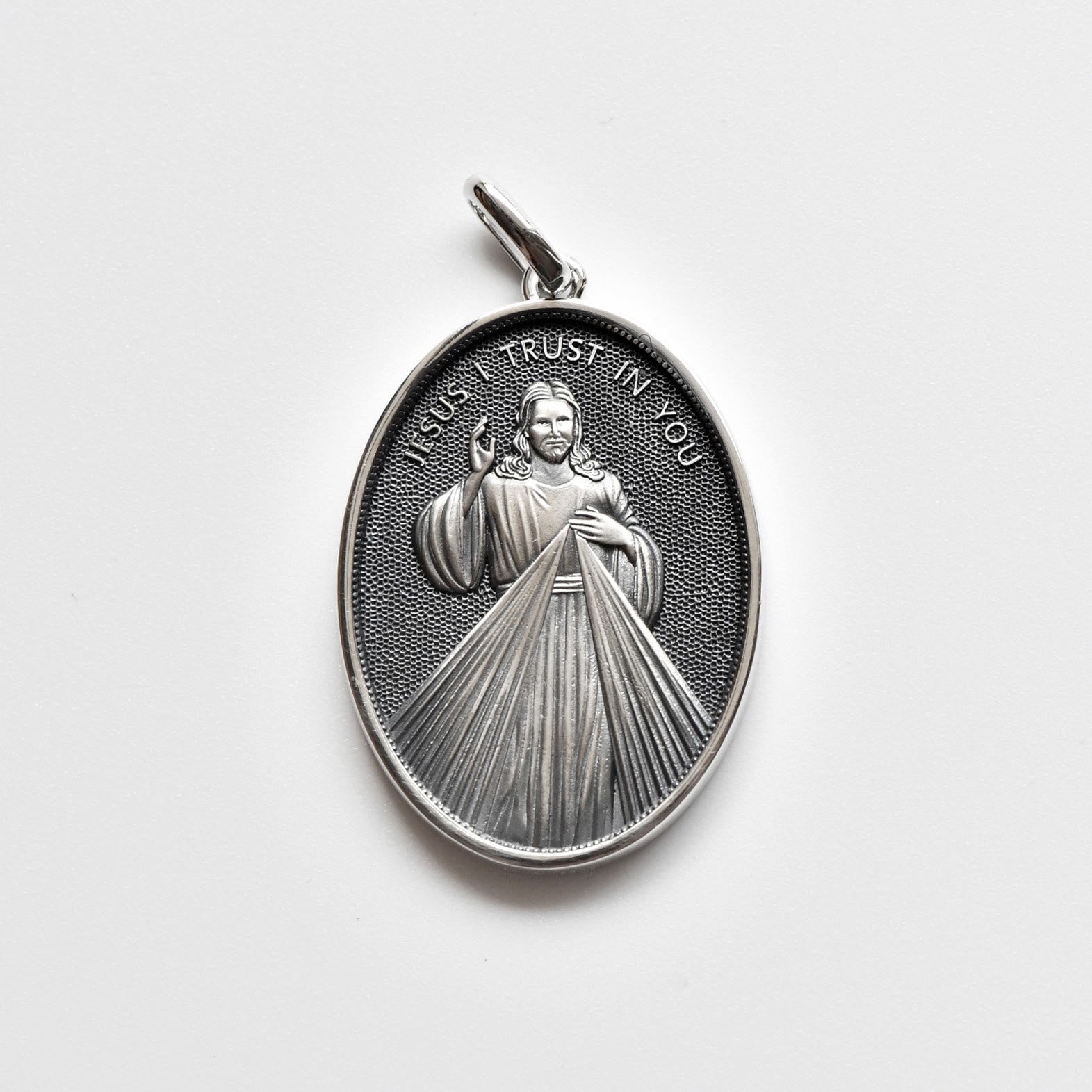 An antique-style sterling silver oval medal glows with the Divine Mercy Jesus—his hand blessing, sacred rays streaming—forged in timeless silver as a beacon of hope and forgiveness. -