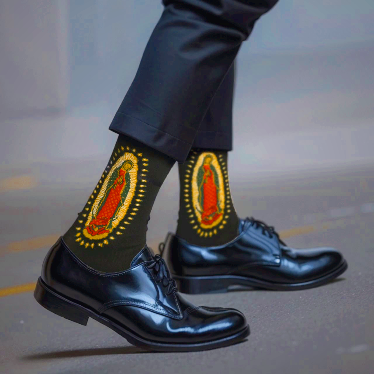 Step forward in devotion with these Black Virgin of Guadalupe Religious Crew Socks. Featuring a vivid print of the Virgin of Guadalupe, they blend faith with comfort. Made from breathable cotton, these one-size-fits-most socks are perfect for daily wear and spiritual occasions. A meaningful gift for believers seeking to express their faith through fashion.