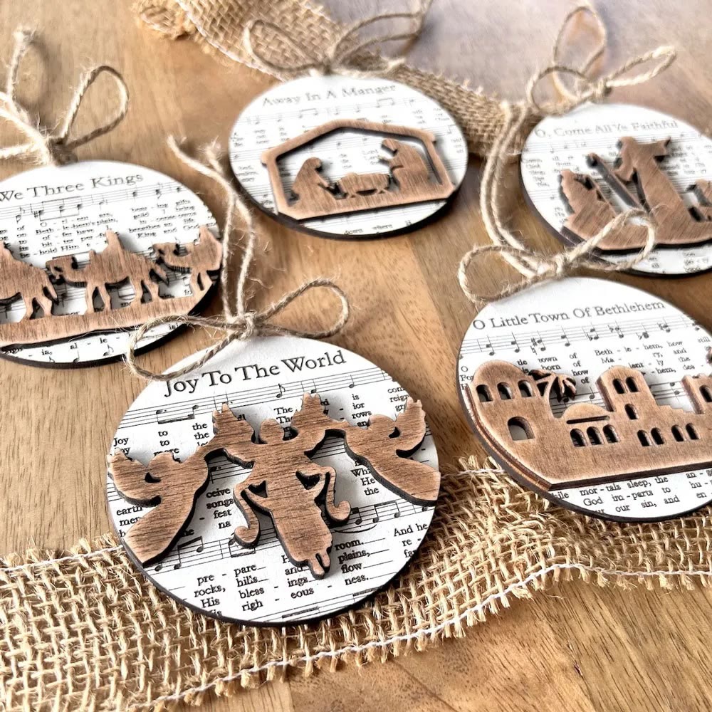 Celebrate the birth of Jesus with this set of 5 rustic-style wooden nativity ornaments. Perfect for Christmas tree decorations, home decor, or as meaningful gifts. Each ornament features a music sheet design symbolizing the nativity scene and is crafted from high-quality wood. Lightweight and durable, these ornaments come in a set of 5 with styles A through E. Handmade with care, they reflect the true spirit of Christmas by highlighting the incarnation of God and His grace. Ideal for adding a touch of faith and warmth to any space.