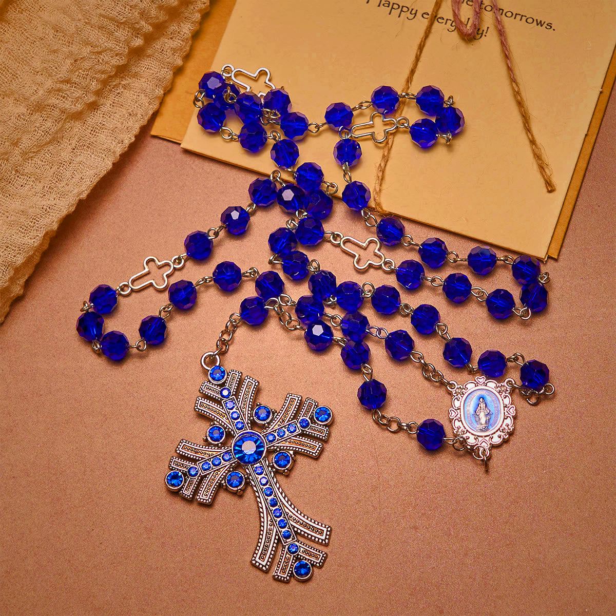 Handmade by devout Christians in Jerusalem, this 8mm blue crystal rosary features a miraculous medal and cross. Perfect for prayer, meditation, and spiritual protection. Includes five decades, acrylic beads, and an alloy chain. Ideal for personal use or as a meaningful gift.