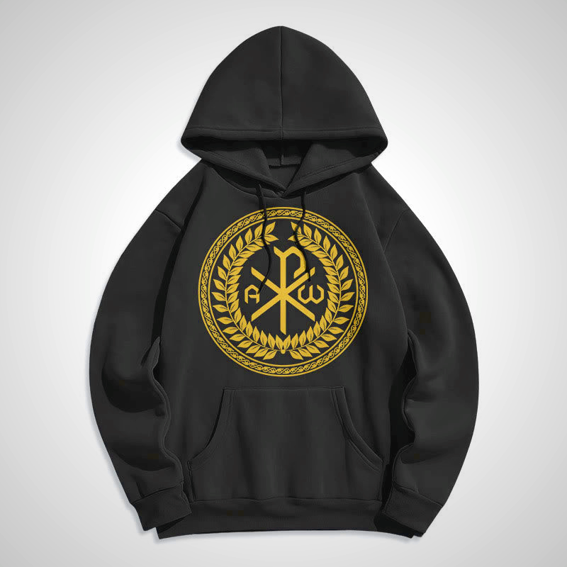 Showcase your faith with this Classic Style Sacred Chi-Rho Emblem Laurel Wreath Fleece Lined Polyester Hoodie. Featuring a gold Chi-Rho symbol surrounded by a laurel wreath, this unisex hoodie is available in multiple colors and crafted from soft, warm fleece-lined polyester. Perfect for church, casual wear, or as a meaningful gift. Made from 100% polyester with a regular fit, it’s comfortable for everyday wear and machine washable for easy care. Sizes S to 2XL available.