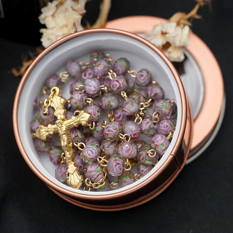 Elegant handmade rosary featuring flower rose glazed glass beads in blue, black, white, sky blue, and grey. Perfect for prayer and devotion. Includes Mary and Crucifix pendant. High-quality glass beads, 8mm size, approximately 100g. Crafted with love and care. Orders processed within one business day. Safe payment and multiple payment methods available.