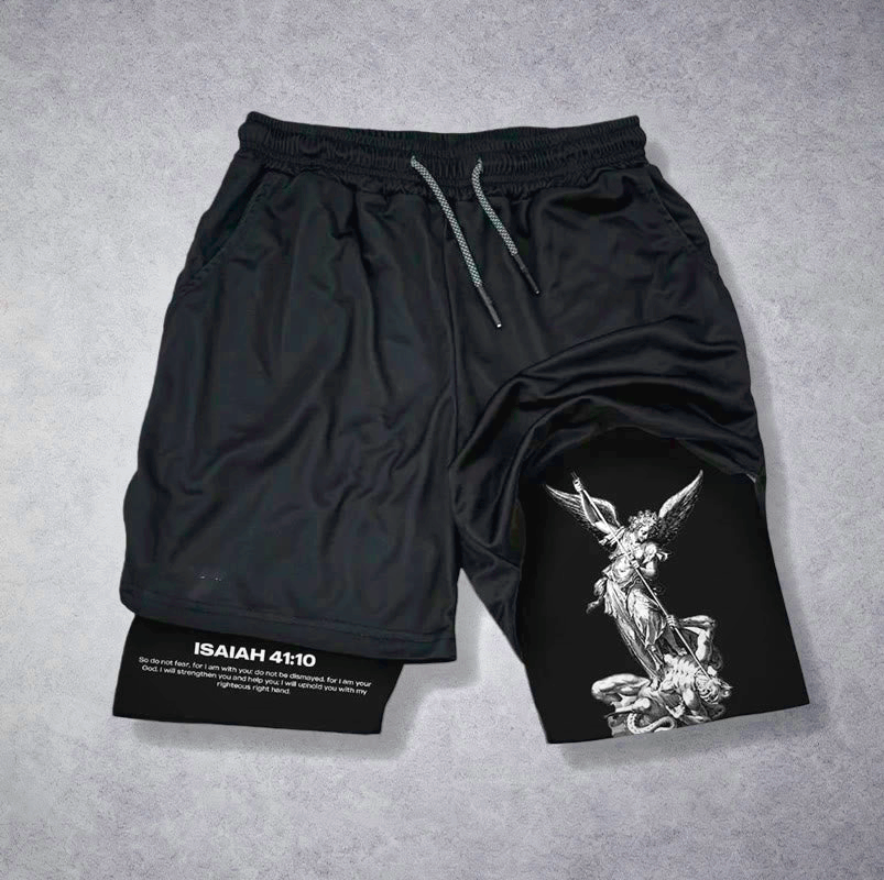 Look good and stay motivated in these limited-edition Christian performance shorts. Featuring a unique Angel and Devil design inspired by Isaiah 41:10, these shorts are made with premium breathable materials including 150g mesh and 16D milk silk for ultimate comfort. Designed with a super stretchy muscle fit, they include functional pockets on the outside layer and a secure inner lining pocket for your phone. Available in sizes XS to 3XL with sublimation printing for long-lasting vibrant colors. Perfect for workouts, sports, or casual wear with a meaningful message.