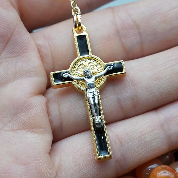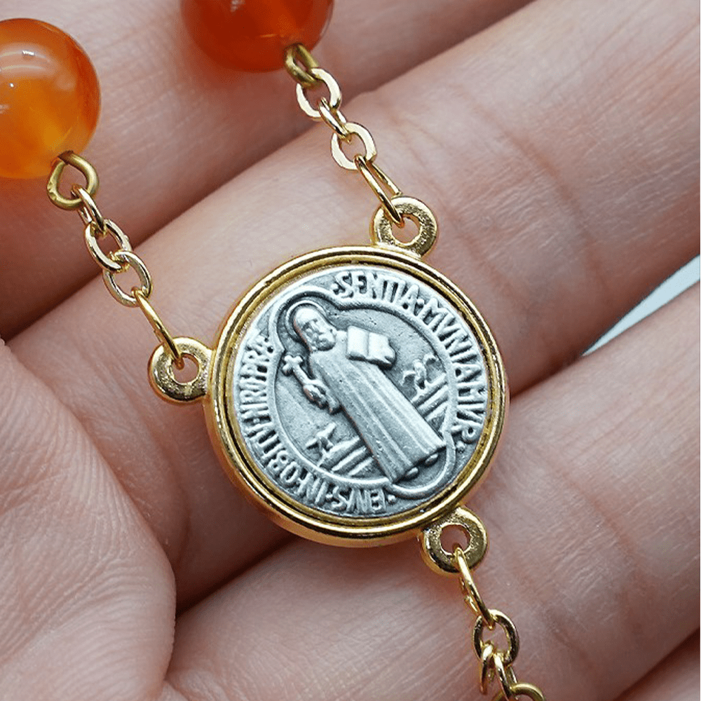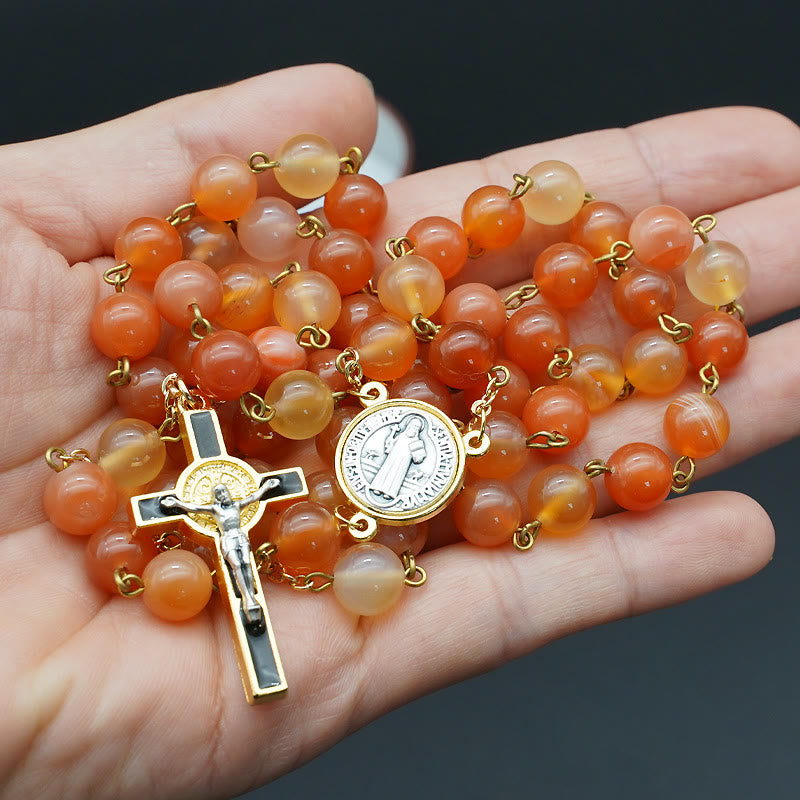 Handcrafted Natural Agate Rosary with St. Benedict medal and Crucifix. Made with 8mm beads, weighs about 100g, and comes with a quality guarantee. Perfect for prayer and spiritual devotion. Orders processed within one business day with safe payment options and responsible shipping.
