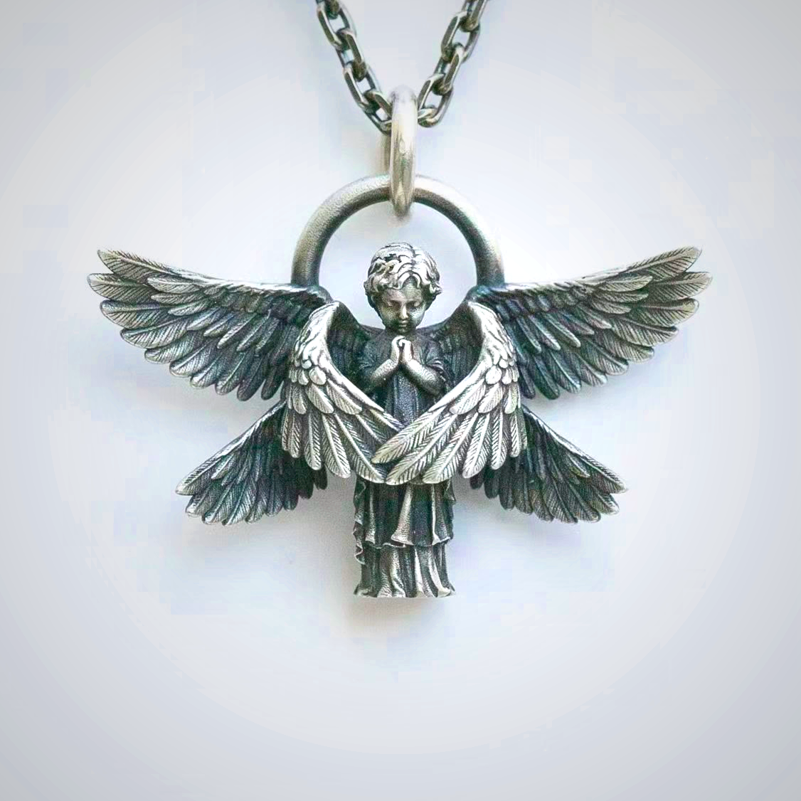 Elegant handmade praying angel wing pendant necklace in silver or golden style. High-quality metal construction, lightweight at 30g. Perfect for spiritual jewelry lovers. Features: