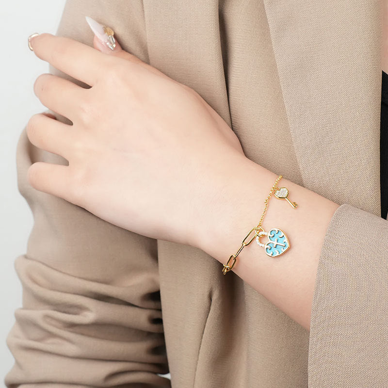 Elegant handmade bracelet featuring a turquoise cross heart-lock design with zirconia accents. Crafted with care, this lightweight accessory weighs approximately 30g and is made from high-quality materials. Perfect for adding a touch of spiritual style to any outfit.