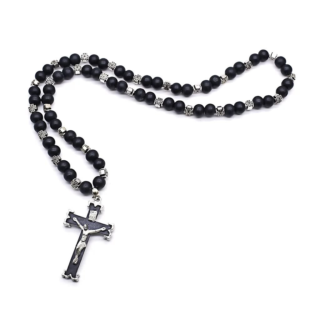 This handmade Christian prayer necklace features a wooden crucifix pendant in black and white designs. Crafted with care, it includes a 21.6-inch chain and measures 2” x 1.14”. Perfect for daily wear or religious occasions. Made from high-quality wood and alloy, this lightweight (50g) piece is both durable and comfortable. Show your faith with this meaningful accessory.