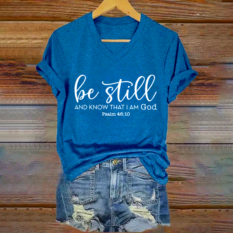 This inspirational Christian t-shirt features a serene design with the message “Be still and know that I am God” from Psalm 46:10. Perfect for daily wear, it serves as a peaceful reminder of faith and trust in God’s presence. Crafted with modal fabric, this casual short-sleeve tee offers comfort with a relaxed fit and breathable material. The v-neck style and printed graphic make it ideal for casual occasions. Machine washable and available in multiple colors including blue, black, white, and green.