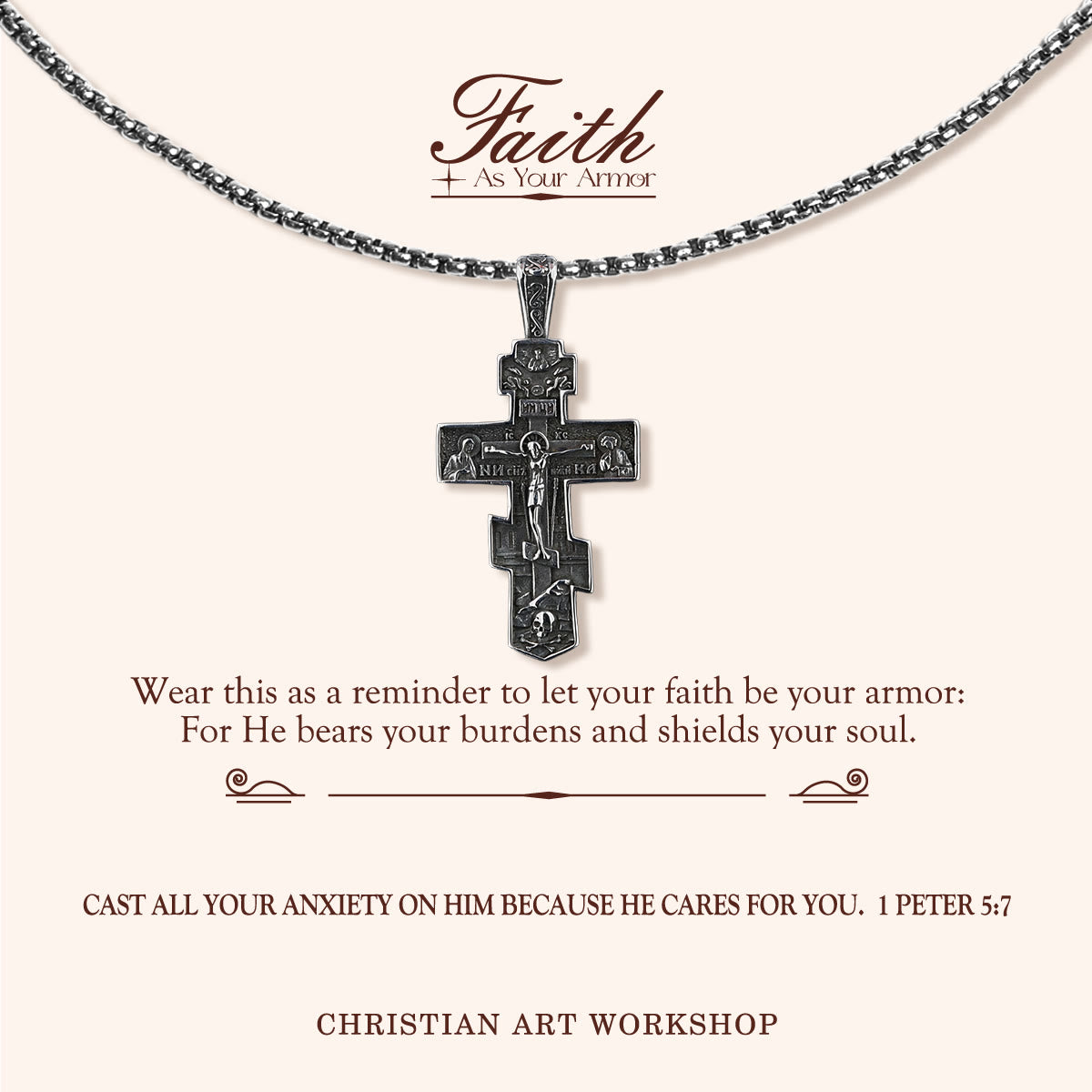 Embrace eternal faith with this intricately carved titanium Orthodox Jesus Crucifix Necklace. Designed with sacred detail and spiritual symbolism, it serves as a daily reminder of devotion and protection. Crafted from durable titanium and stainless steel, the pendant features a 2.5”x1.3” crucifixion scene with holy figures, complemented by a 23.62” chain. Perfect for gifting or personal wear, this lightweight (approx. 30g) piece is handmade with care and offers a timeless expression of belief. Specifications: Titanium pendant, stainless steel chain, adjustable length, and premium craftsmanship ensure lasting quality.
