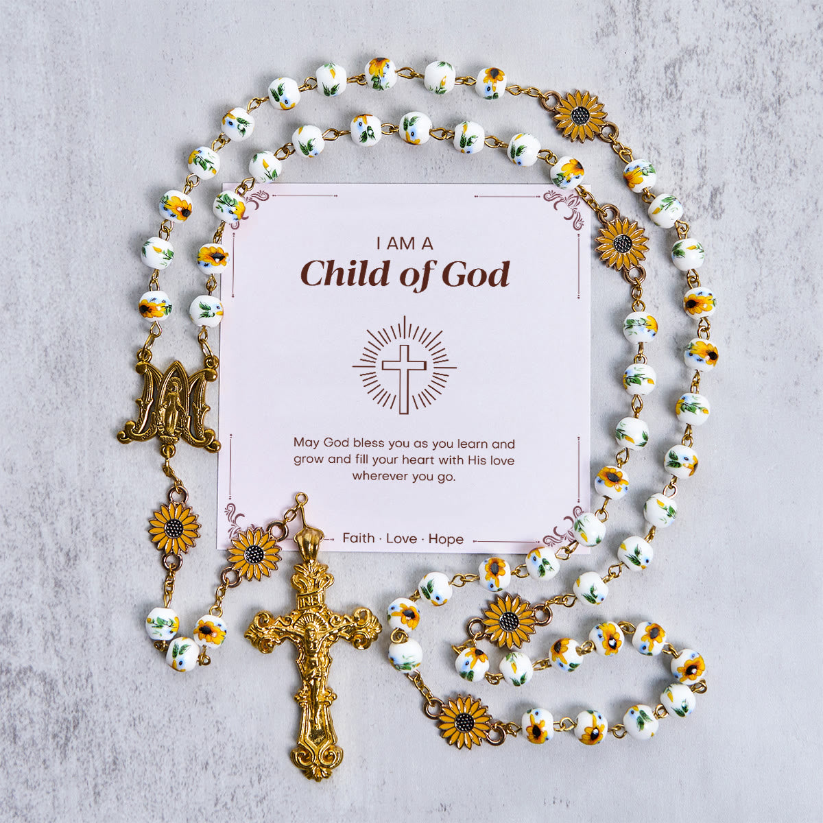 This beautifully crafted handmade rosary features sunflower-inspired beads symbolizing faith and divine light. Designed with a Miraculous Medal centerpiece, it serves as a meaningful tool for prayer and meditation. Perfect for spiritual growth and comfort, this yellow ceramic rosary combines aesthetic elegance with deep religious significance.