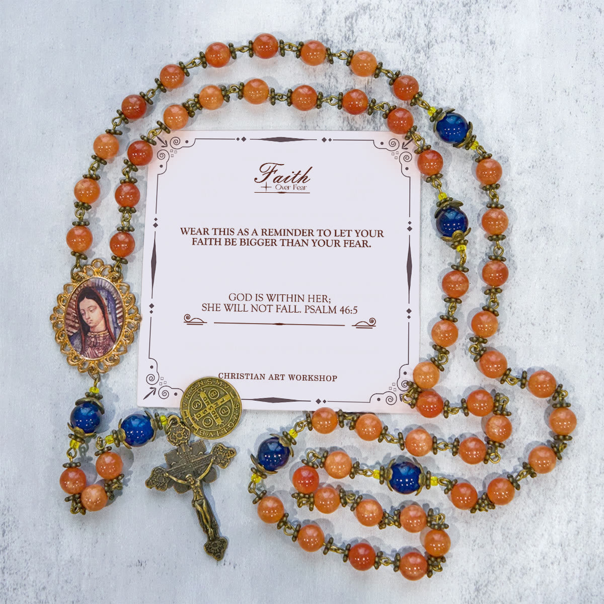 Handcrafted Orange Chalcedony Rosary featuring sacred symbols including a crucifix, St. Benedict medal, and Our Lady icon. Perfect for prayer and meditation, this five-decade rosary is made with high-quality orange chalcedony beads and detailed metalwork. A meaningful faith piece that combines spiritual significance with exquisite craftsmanship.