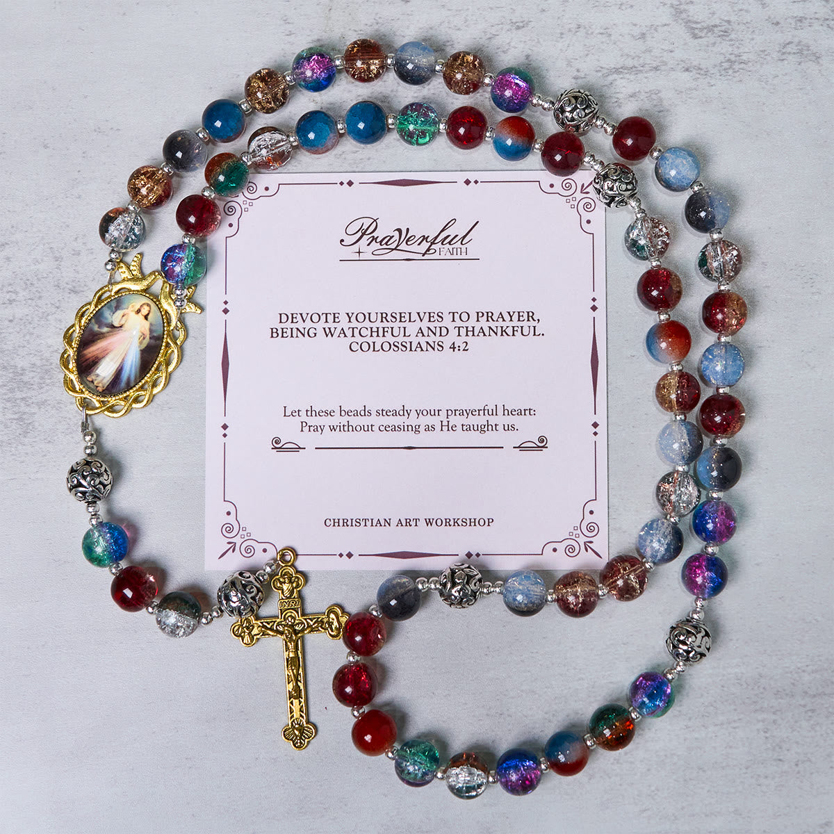Handmade rosary featuring gradient multicolor glass beads and a warm brass crucifix, symbolizing peace and grace. Perfect for daily prayer and spiritual reflection. Includes a Divine Mercy medal and comes with a gift card. Ideal for gifting or personal devotion. Specifications: Five-decade design, 8mm glass beads, iron wire rope, and a total length of 75cm. Crafted with care for lasting quality.