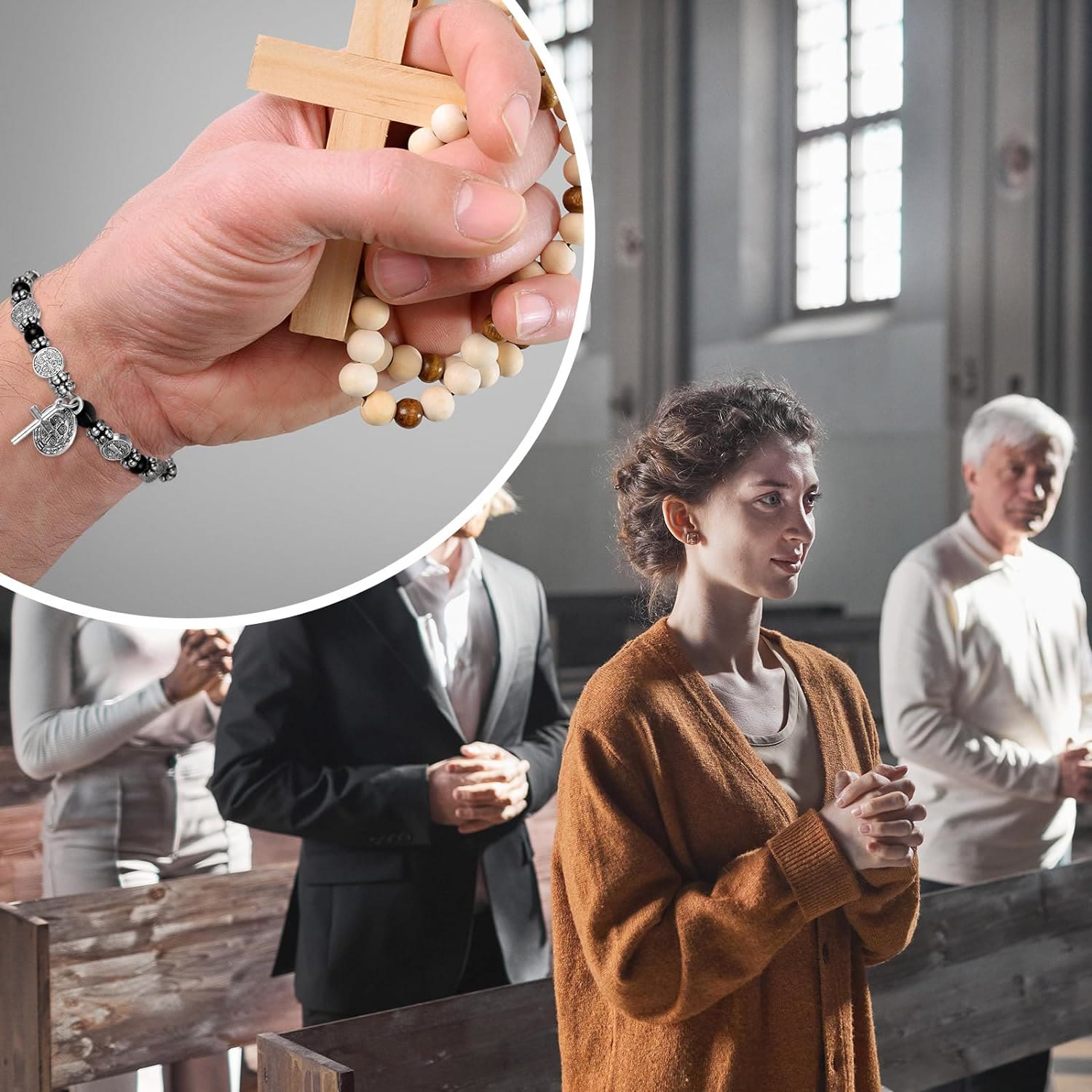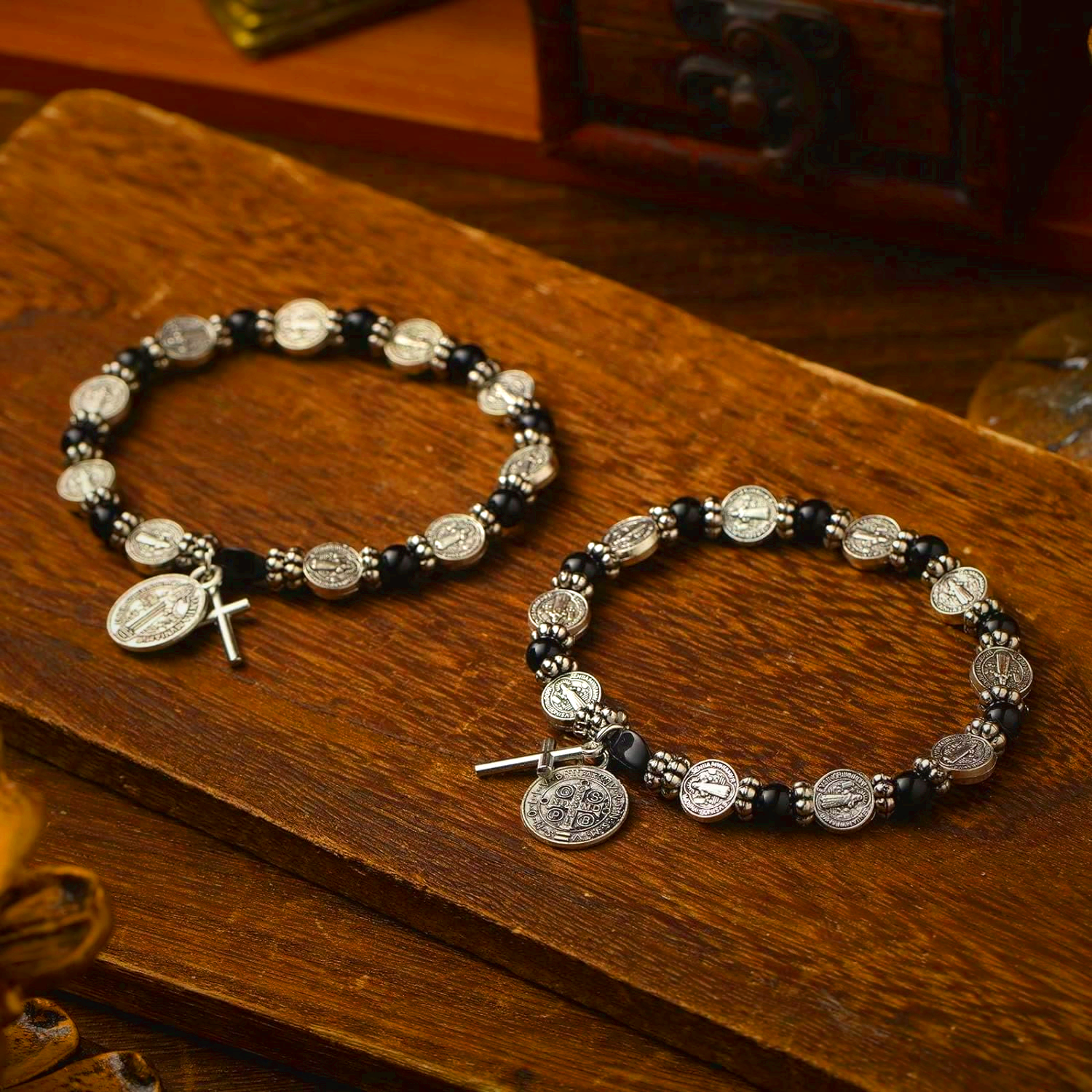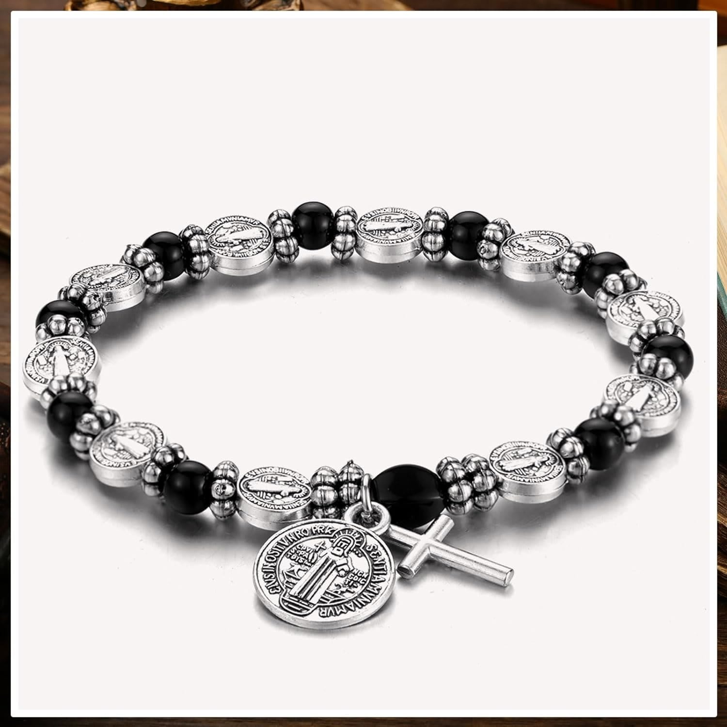 Elegant handmade bracelet featuring a silver St. Benedict medal and rosary beads. Adjustable size, lightweight alloy construction, and high-quality craftsmanship. Perfect for daily wear or spiritual devotion. Orders processed within one business day with safe payment options and reliable shipping.