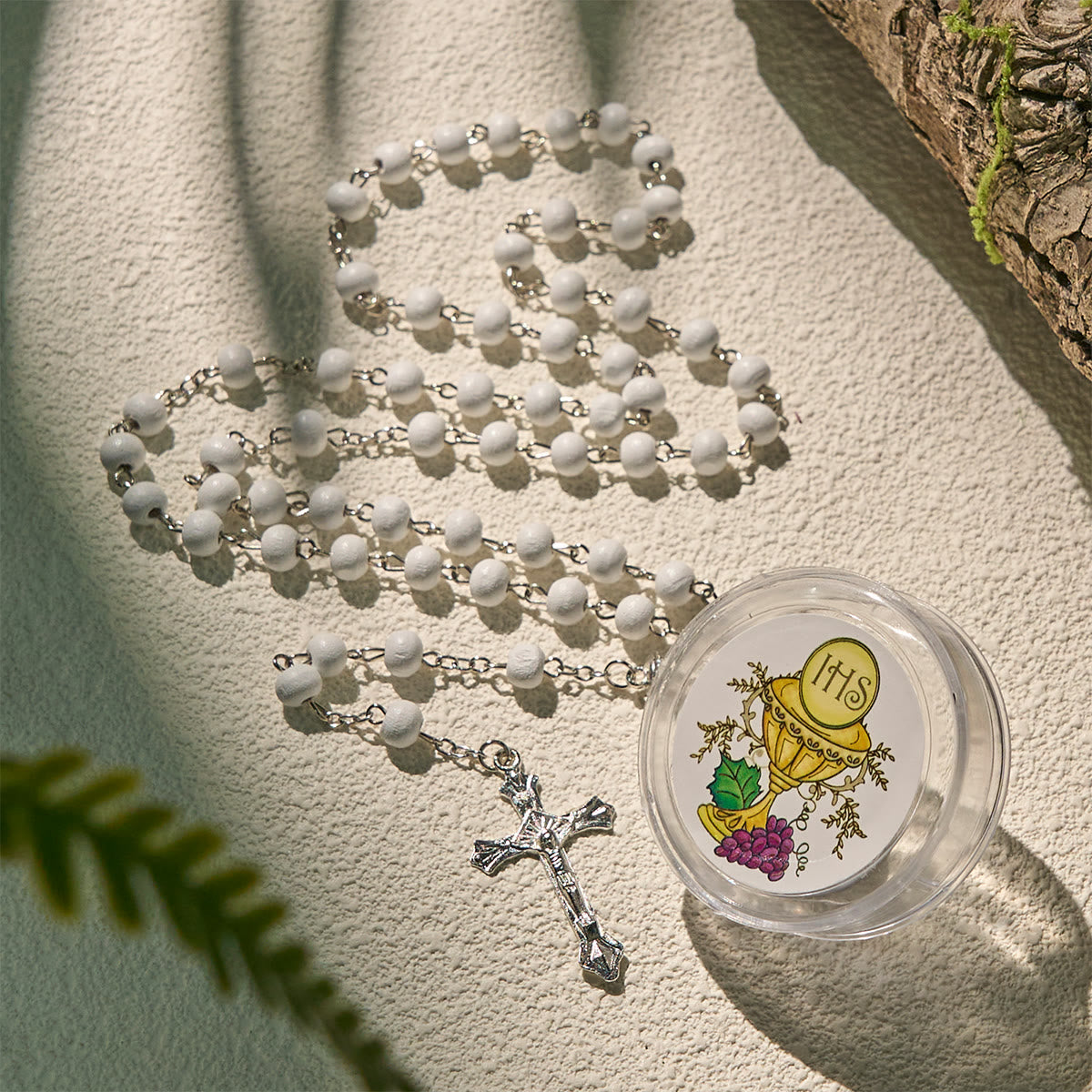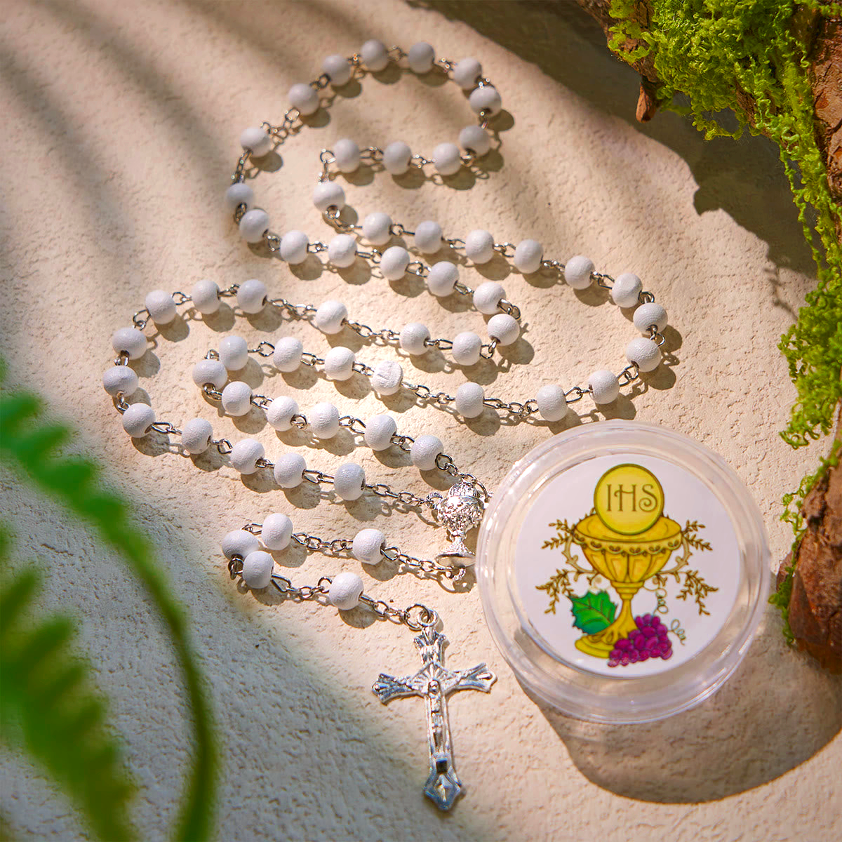 Divine Wooden Holy Chalice Communion Rosary in White with Gift Box Bundle