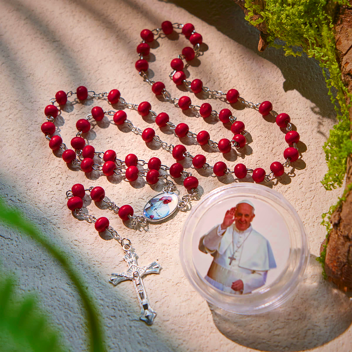 Divine Wooden Rosary in Red and White with Pope Francis Blessing Case