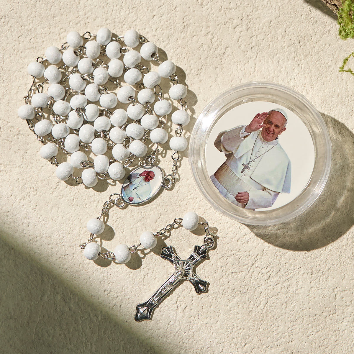 At the heart of this rosary is a medallion featuring Pope Francis, a symbol of humility, compassion, and divine blessing, paired with a sacred crucifix that represents faith and redemption. -