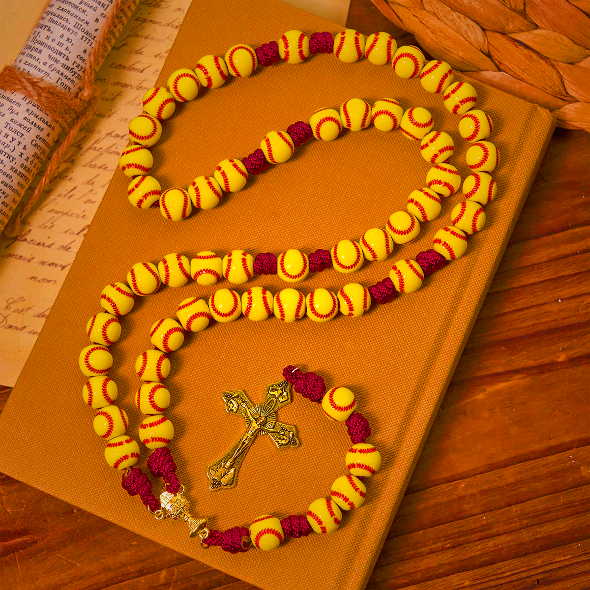 This softball-inspired rosary features bright yellow beads with red stitching, symbolizing faith and athletic passion. Crafted with durable nylon cord, it’s perfect for daily prayer or as a unique gift. Includes a Holy Grail and Crucifix for spiritual inspiration.