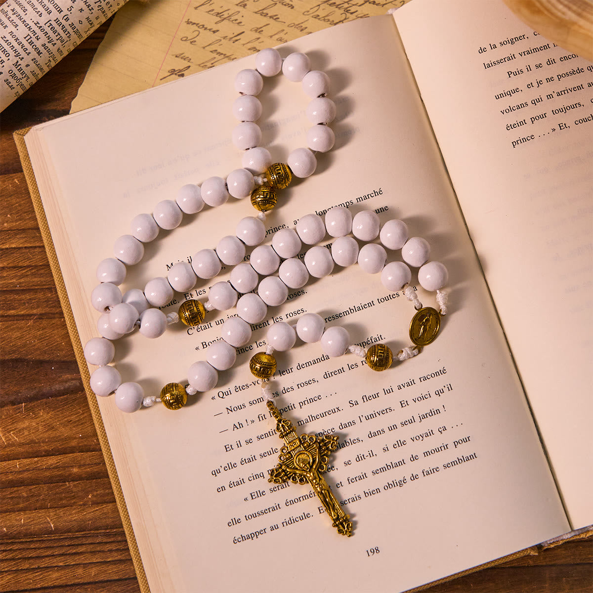 Adorned with smooth white beads and intricately crafted golden elements (including the crucifix and decorative beads), each component blends simplicity with reverence. The pure white hue paired with warm gold tones creates a harmonious, sacred visual charm. -