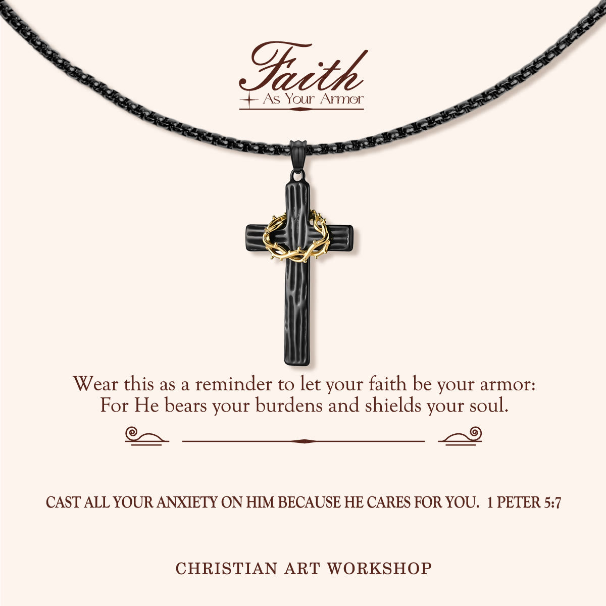 Celebrate your faith with the FAITH AS YOUR ARMOR Jesus Crown of Thorns Cross Necklace. This modern-style pendant features a detailed Crown of Thorns design on a stainless steel cross, available in silver or black. Crafted with high-quality materials, it comes with a durable 60cm chain and is perfect for daily wear or special religious occasions. Ideal for baptisms, confirmations, or as a meaningful gift. Handmade with care, this necklace blends spiritual significance with contemporary elegance.