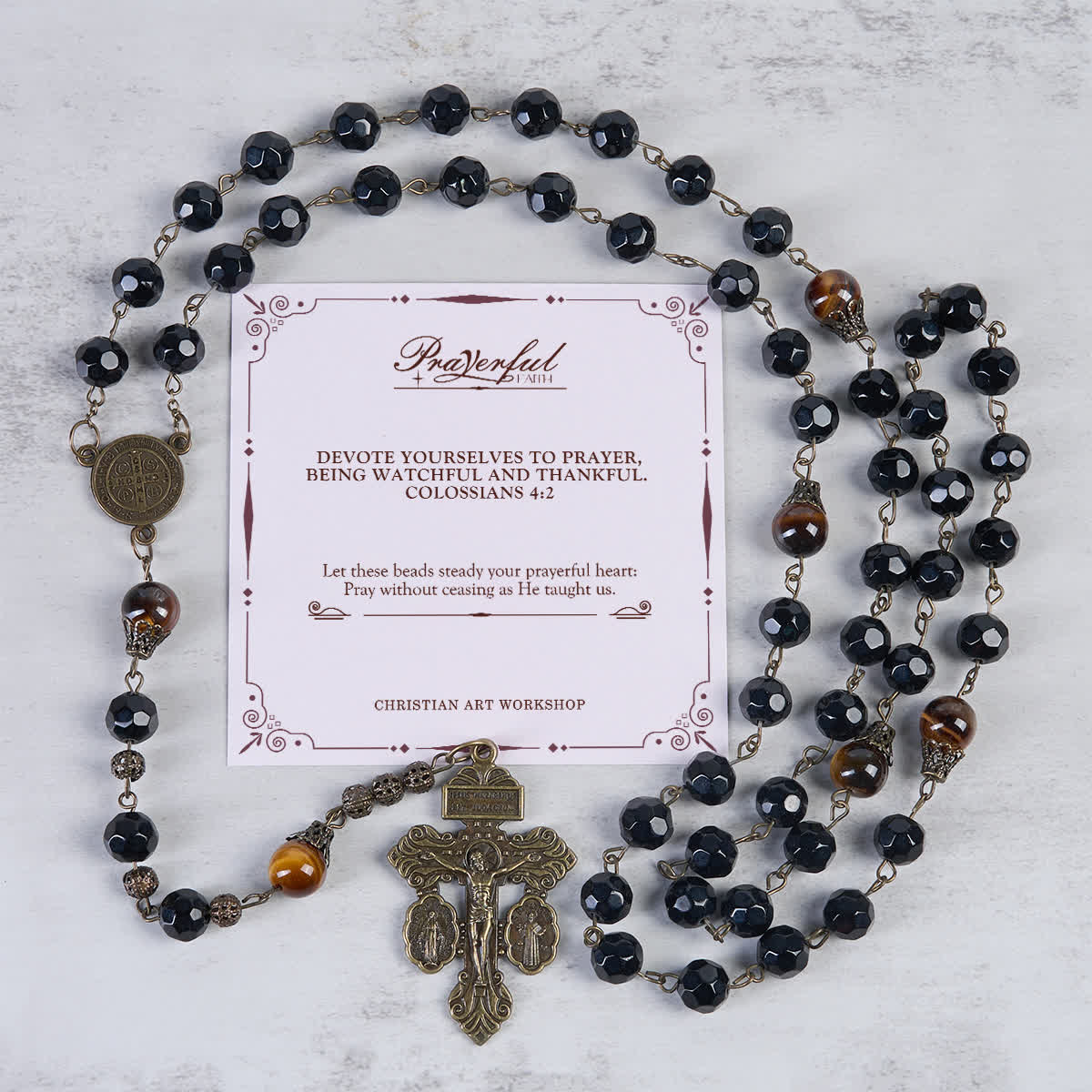 Deep obsidian beads swirl with mystery beside golden tiger eye stones, anchored by a potent Pardon crucifix and St. Benedict medal—divine protection made tangible. -