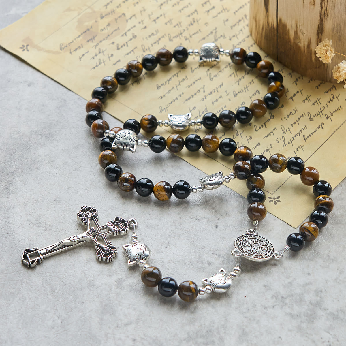 This rosary combines deep brown and black beads with stainless steel cat-face charms, reflecting the tabby cat’s natural stripes. A prayer tool that unites faith and creation, it embodies both devotion and compassion. -