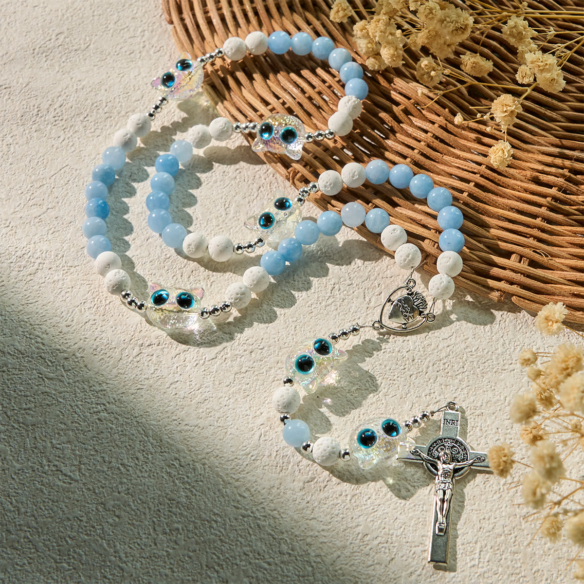 The gentle blue and white beads evoke the peace of Heaven, while the shimmering kitty accents symbolize the innocence and beauty of God’s creation, echoing the truth that all life is precious in His eyes. -