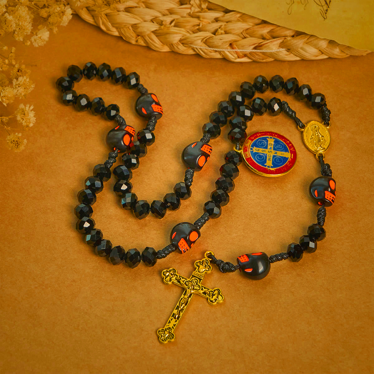 Combining timeless religious symbols (crucifix, St. Benedict, Miraculous Medal) with All Hallows’ day – inspired black – and – orange skull detailing, it serves as a cherished prayer tool and a meaningful gift for those who cherish both faith and All Hallows’ day enigmatic magic.