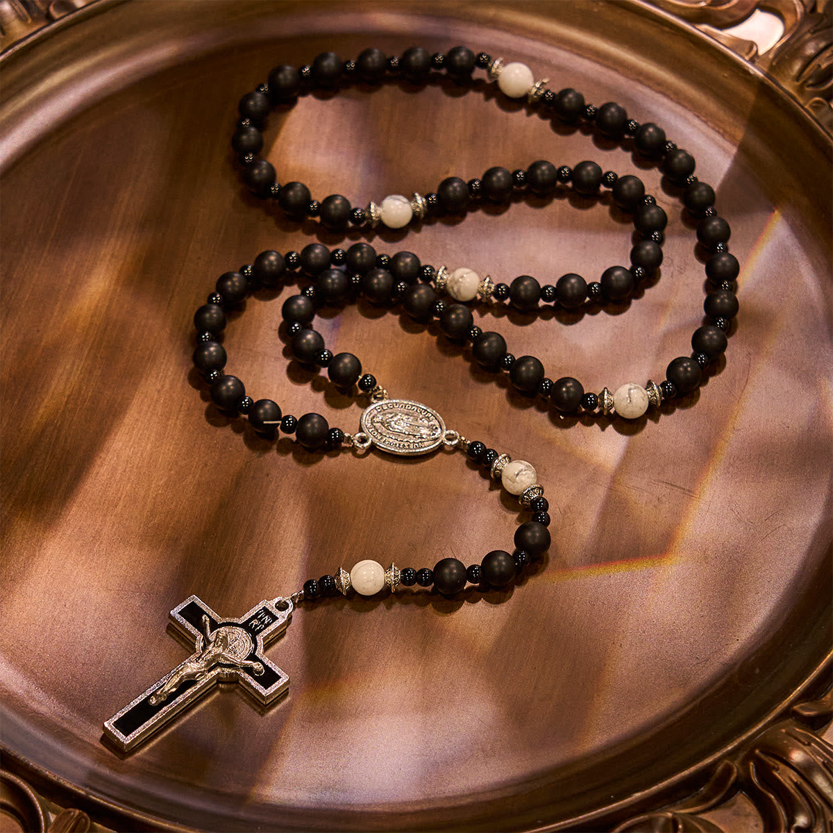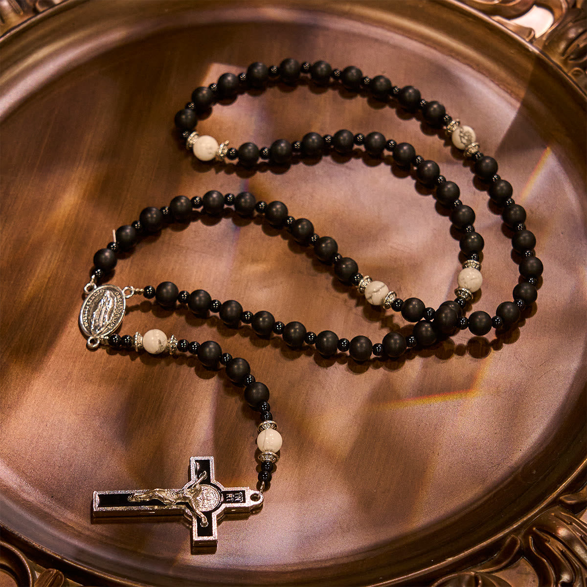 Handcrafted matte black acrylic rosary with silver accents, featuring a detailed crucifix and Our Lady of Guadalupe charm. Ideal for prayer and reflection, this 5-decade rosary offers a tactile, meaningful experience. Perfect for personal use or as a thoughtful gift.