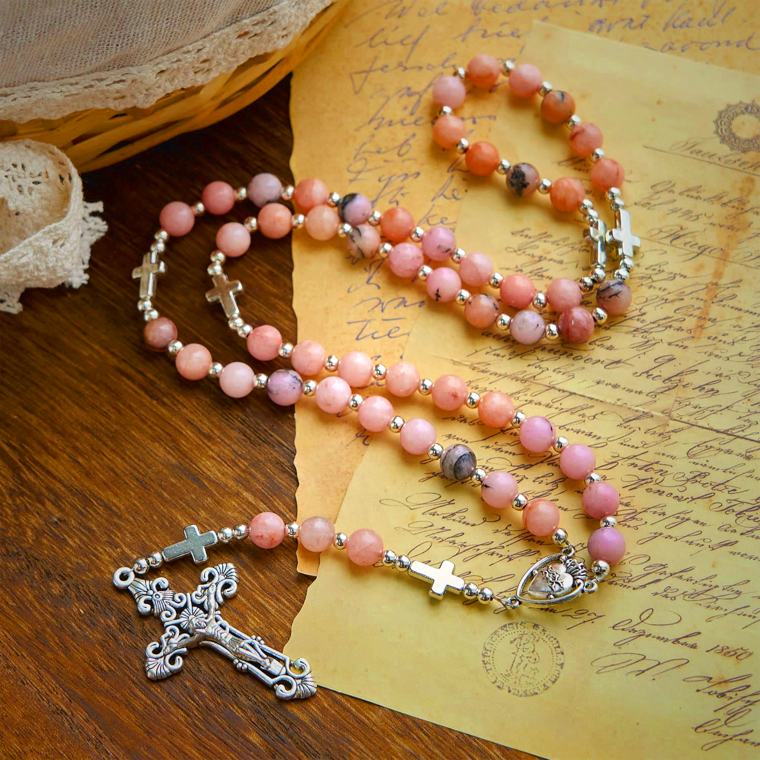 This Handmade Rosary features delicate pink round beads and a Sacred Heart medallion, symbolizing divine love and faith. Perfect for prayer or as a meaningful gift. Specifications: 8mm white stone beads, alloy chain, 50+15cm length, includes Sacred Heart medallion & crucifix. Crafted with care for spiritual devotion.