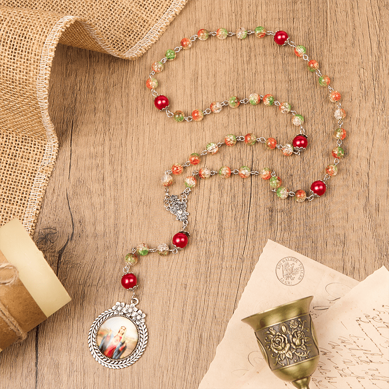 Jesus Heart & Marry Medal of 8mm Orange-green Glass Round Beads Rosary