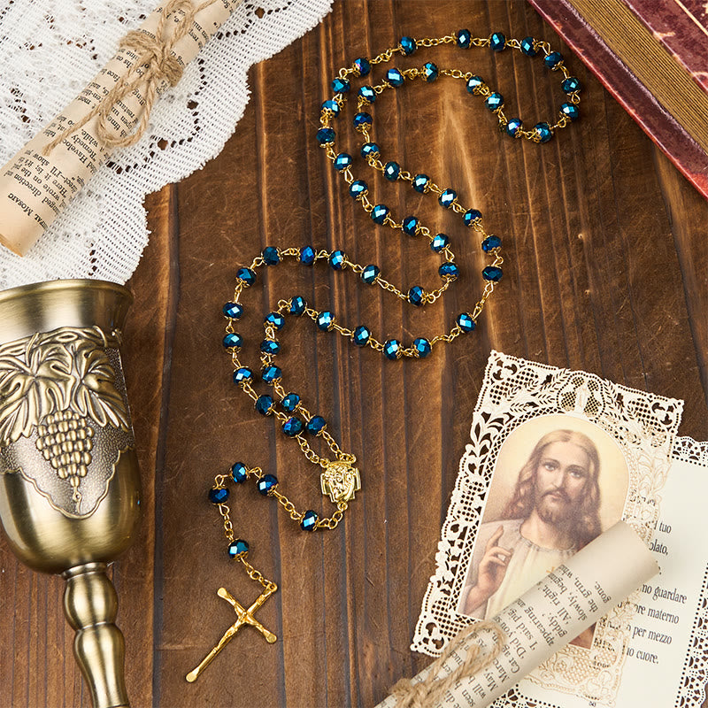 Introducing the Heavenly Majesty Rosary, an exquisite piece designed to enrich your prayer life and deepen your connection with Christ. This rosary features radiant blue beads paired with lustrous gold details, bringing an air of heavenly elegance to your devotional practices. -