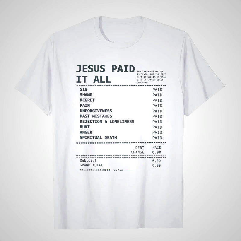 This Jesus Paid It All T-shirt features a powerful design listing human struggles like sin and shame, marked as ‘PAID’—a reminder of Christ’s redemptive sacrifice. Perfect for casual wear, this unisex tee is made from 100% combed ringspun cotton, offering comfort and breathability. With a relaxed fit, round neck, and short sleeves, it’s ideal for everyday inspiration. Machine washable and available in multiple colors including White, Black, Blue, and more.