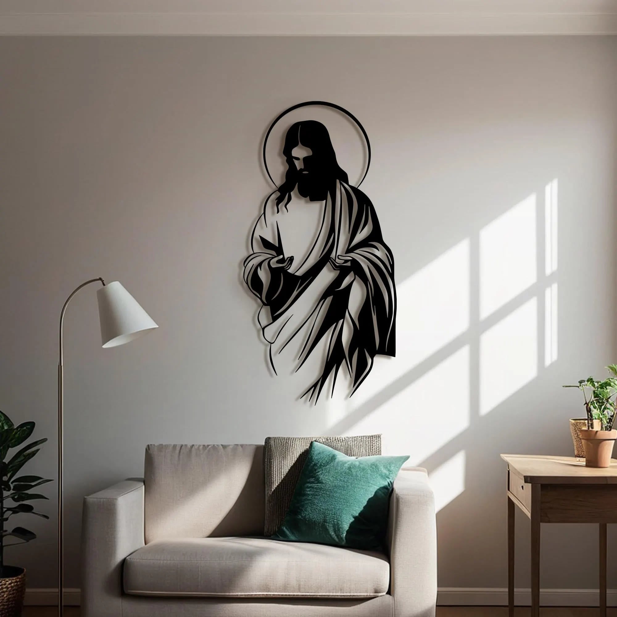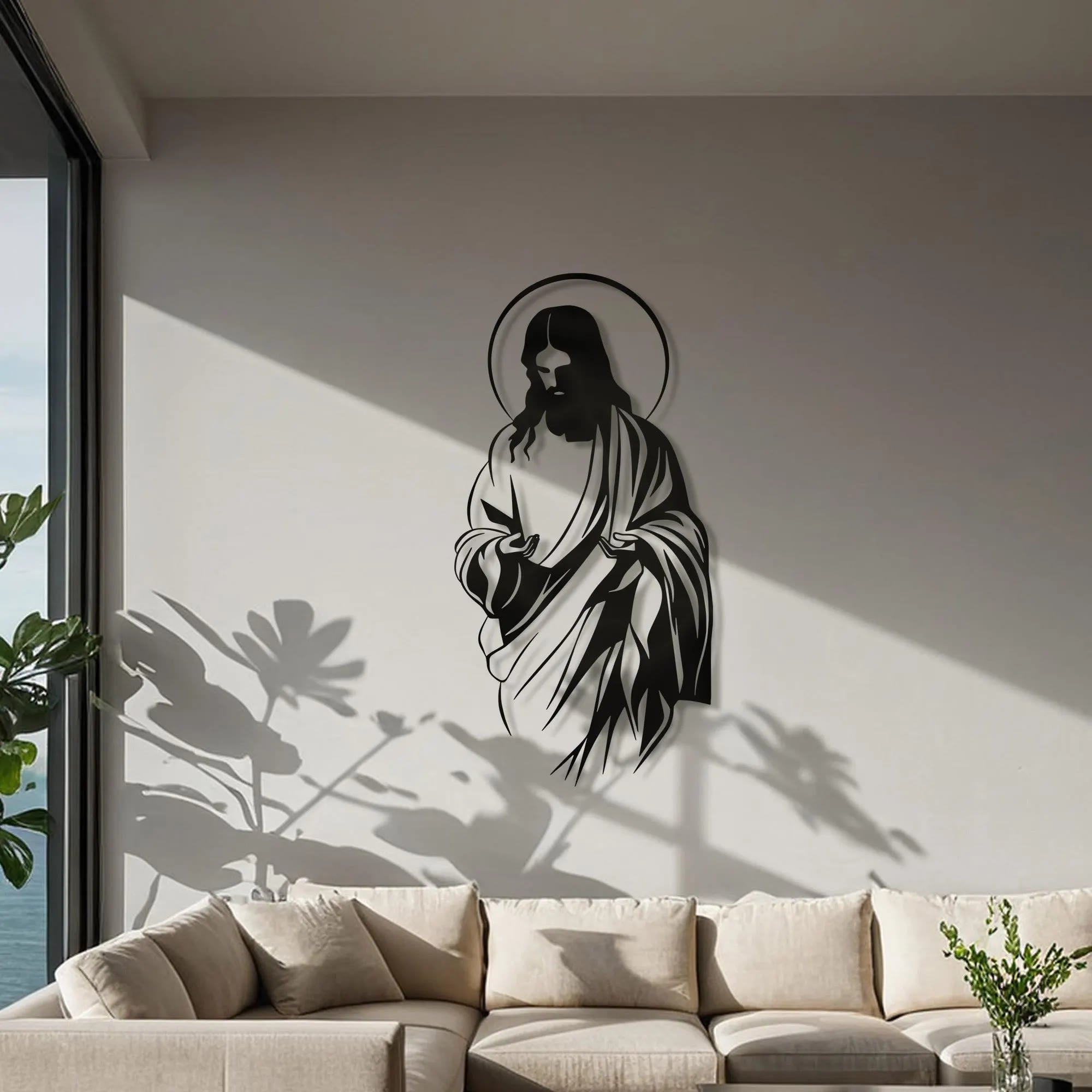 Elevate your spiritual space with this Jesus silhouette metal wall decor featuring a radiant halo. Expertly crafted from premium metal with anti-rust coating, it’s designed for durability and elegance. Perfect for living rooms, prayer corners, or church spaces. This faith-inspired artwork makes a meaningful gift for housewarmings or religious celebrations. A portion of proceeds supports spiritual communities and worship spaces.
