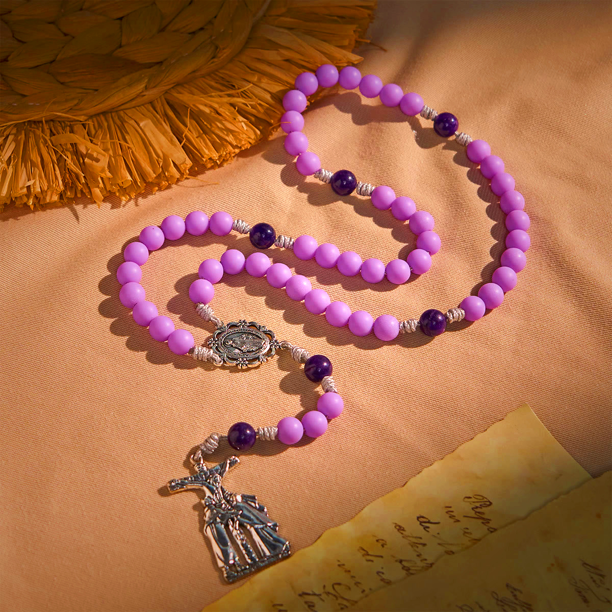 Lavender Matte Rosary Adorned with Crucifix Scene and Miraculous Medal