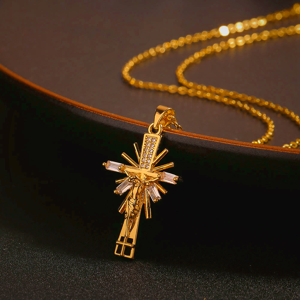 A luxurious gold crucifix necklace with diamond accents, symbolizing faith and resilience. Perfect for gifting or personal devotion.