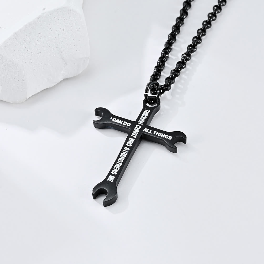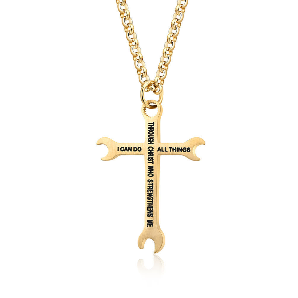 This unique cross necklace combines the symbolism of the Cross with a wrench design, engraved with Philippians 4:13: “I can do all things through Christ who strengthens me.” The Cross represents Christ’s sacrifice and redemption, making this piece meaningful for faith, work, and daily life. Crafted from high-quality stainless steel, it features a tricolor design in golden, black, and silver. Perfect for personal motivation or as a gift. Product Details: Category: Necklace; Material: Stainless Steel; Pendant Size: 1.49” x 1.10” / 3.8 x 2.8 cm; Chain Length: 23.6” / 60 cm; Weight: 0.16 oz / 4.5 g. Why Choose Us: Great quality guarantee, safe payment options, responsible shipping, and fast processing within one business day.