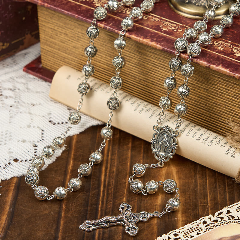 Radiance of Faith Rosary: A Sacred Symbol of Devotion. Illuminate Your Spiritual Journey with this beautifully crafted rosary featuring silver beads and meaningful religious icons. Handcrafted to Perfection with intricate floral patterns and durable silver-tone chain. The centerpiece medallion showcases the Virgin Mary and an ornate crucifix, inspiring reflection and deeper faith. Ideal for Personal Use and Gifting on special occasions. Specifications: 10mm silver acrylic beads, alloy chain, five decade design, 24”+6.9” length, 3.53oz weight. Perfect for daily devotion or as a thoughtful spiritual gift.