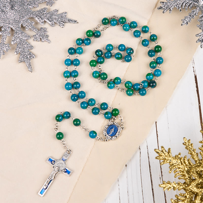 Miraculous Medal & Crucifix of 8 mm Round Green Blue Stone Alloy Chain Rosary
