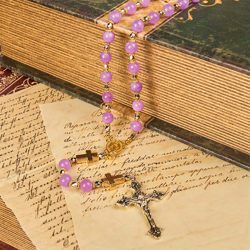 Interspersed with the lavender beads are radiant golden spacers, representing the glory and divinity of Christ. These accents add an element of beauty and reverence, making your prayer experience even more profound and rich in meaning. -