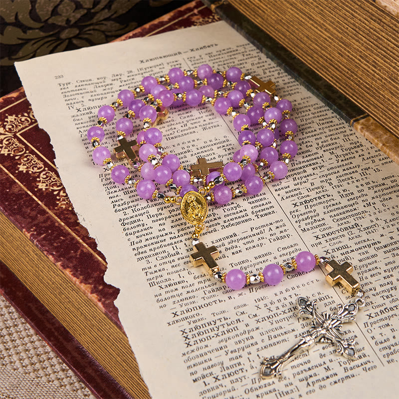 The calming lavender beads symbolize serenity, devotion, and spiritual harmony. As you move from bead to bead, let the gentle hue remind you of the peace and love of Christ that surrounds and fills your heart. -