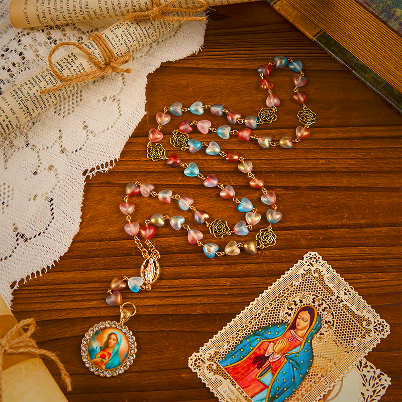 Miraculous Medal & Immaculate Heart of 10mm Heart Rose Multicolor Glass Alloy Chain Rosary