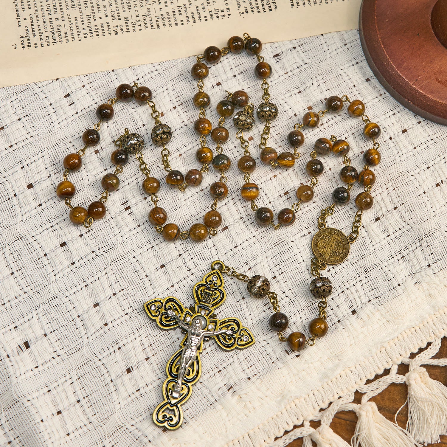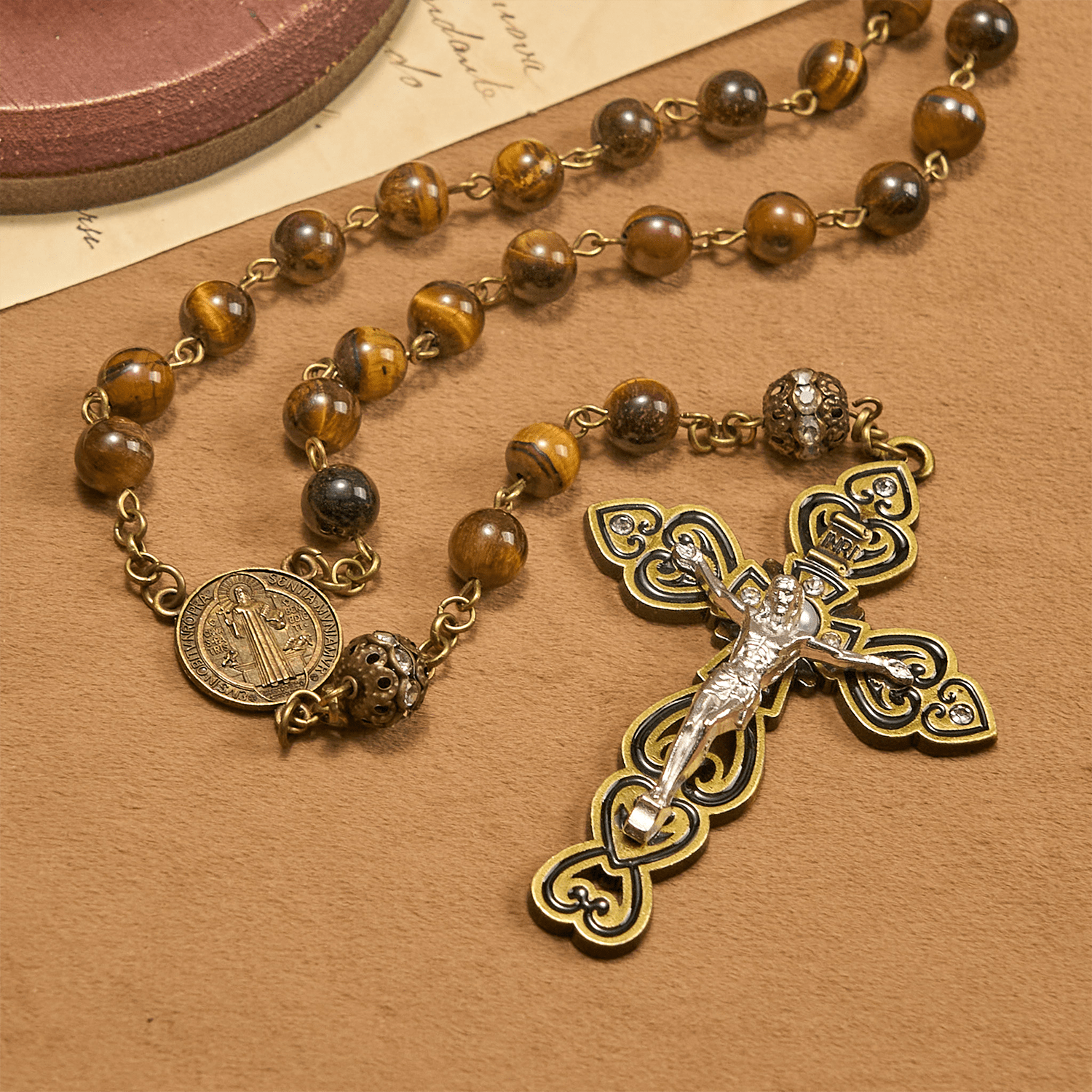 Bold tiger eye beads glow with golden bands, strung beside a warm bronze St. Benedict medal and crucifix—a divine shield for the faithful soul. -