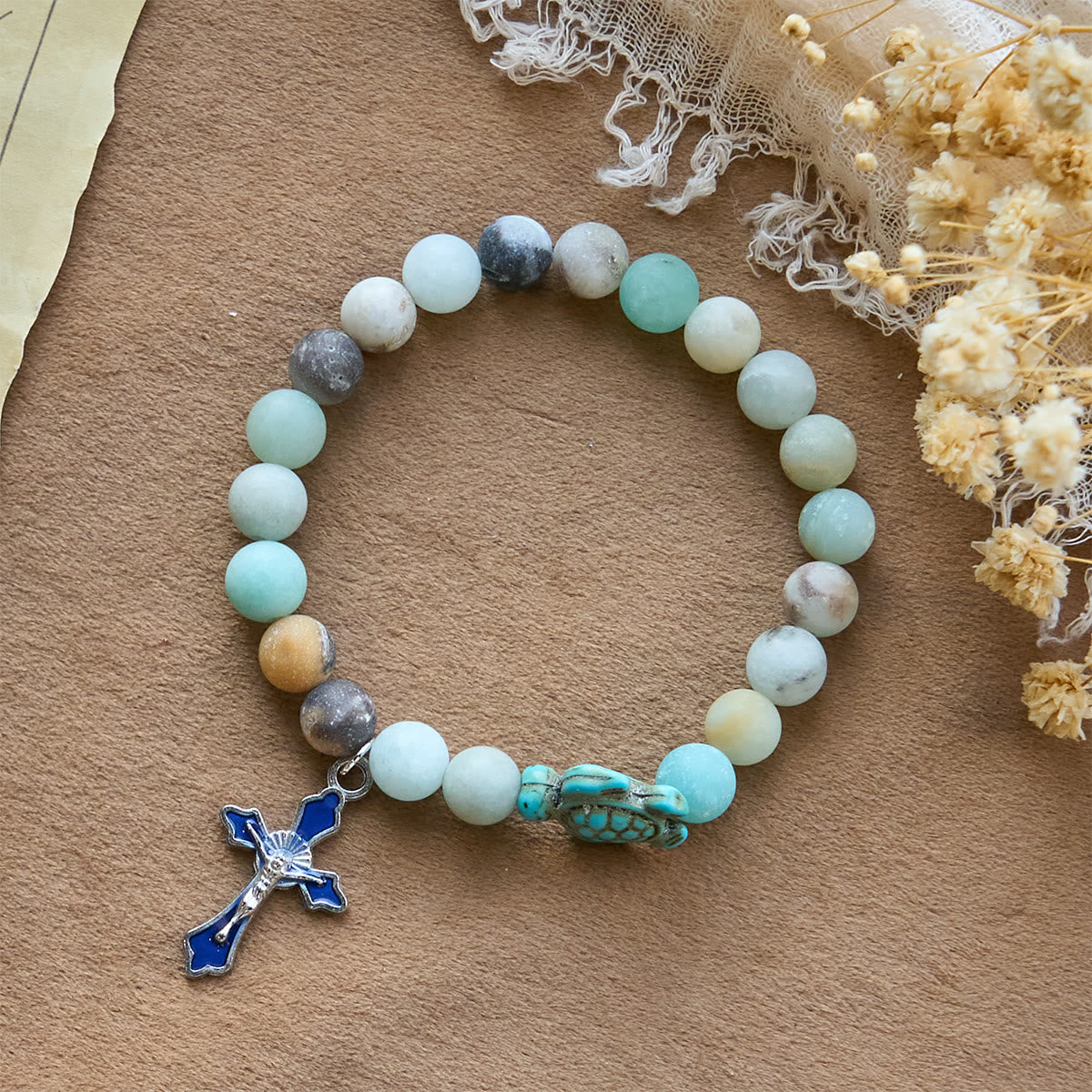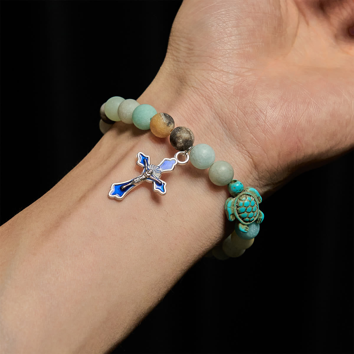 A meaningful bracelet featuring natural stone beads, a turtle charm, and a blue enamel Cross. Perfect for daily wear or as a thoughtful Christian gift. Specifications: 8mm round beads, elastic rope, adjustable 6.69-7.48”, lightweight at 20g. Handmade with care and high-quality materials.