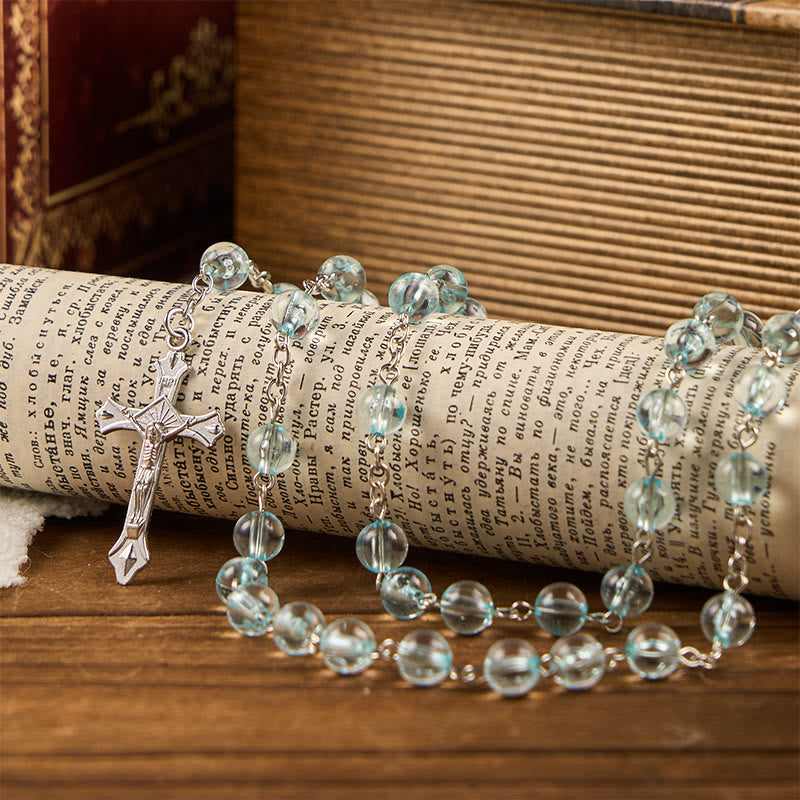 Our Lady & Crucifix of 8mm Round Glass Blue Alloy Chain Rosary