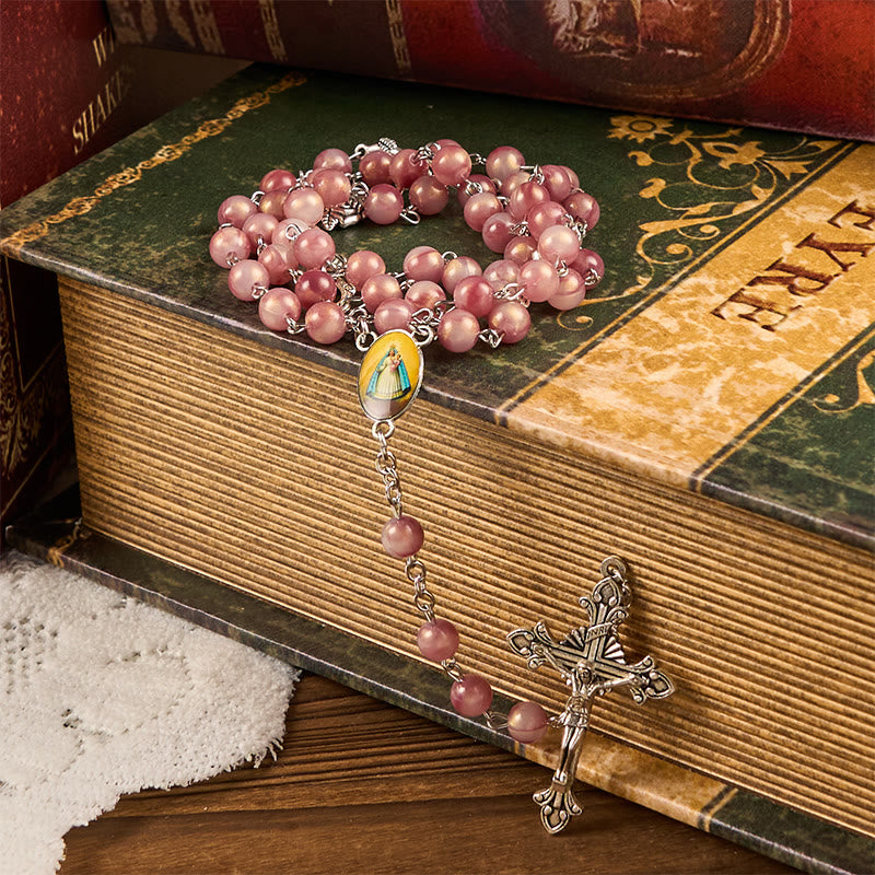 Our Lady & Crucifix of 8mm Round Rose Pink Alloy Chain Rosary