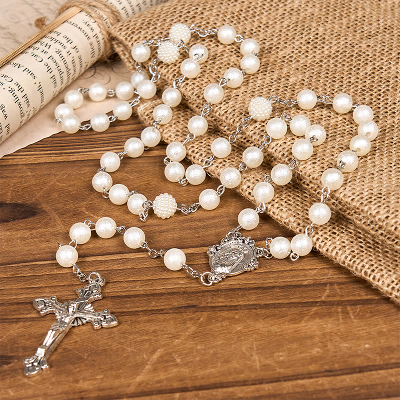 The pearls on the rosary are carefully selected, uniform in size and of high quality. The silver chain links cleverly connect the pearls, and the connection is delicate and firm, showing the exquisite craftsmanship. The silver cross and holy medal are delicately carved with lifelike patterns, which not only add a solemn and elegant temperament to the rosary, but also make it a sacred treasure worth collecting for generations. -