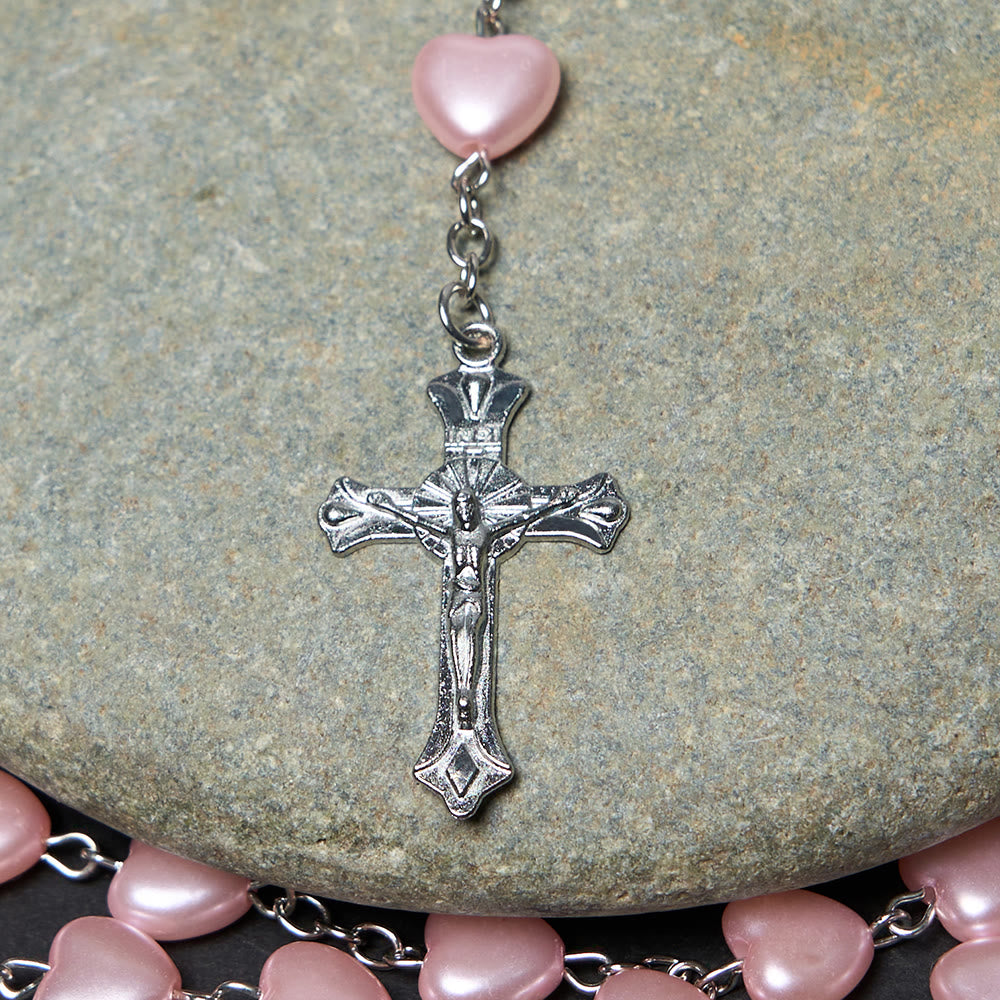 Our Lady of Fátima & Crucifix of 10 mm Heart Pink Acrylic Alloy Chain Rosary
